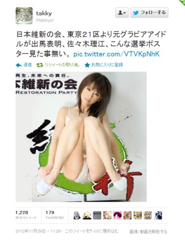 http://twitter.com/takkycl/status/273976849758044160 (現在は削除) 日本維新の会、東京21区より元グラビアアイドルが出馬表明、佐々木理江、こんな選挙ポスター見た事無い。 どう見ても合成だしこんな候補者名も政党名もまともにかかれてない選挙ポスタ…